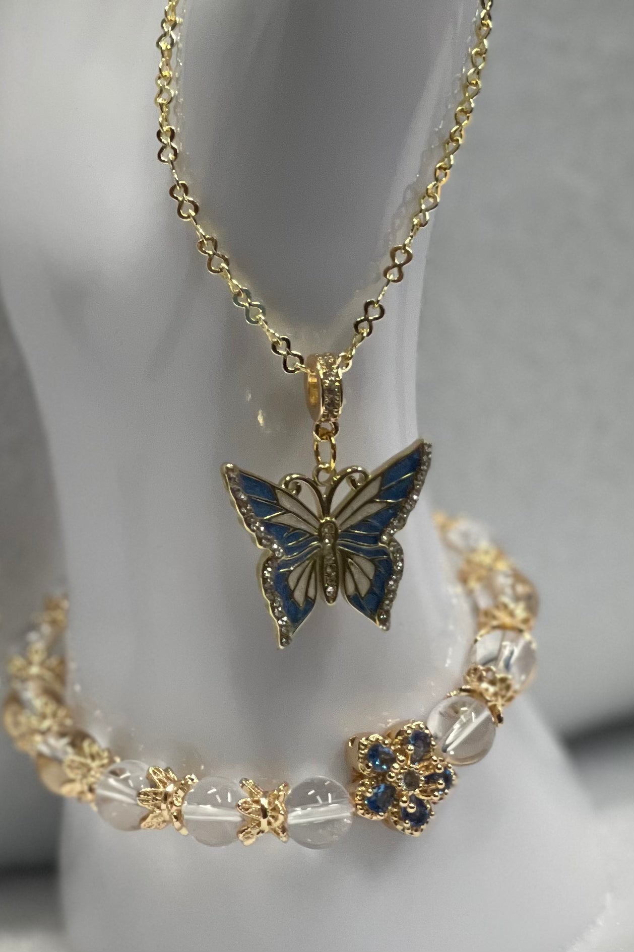 Blue and gold rhinestone bracelet with clear quartz beads.